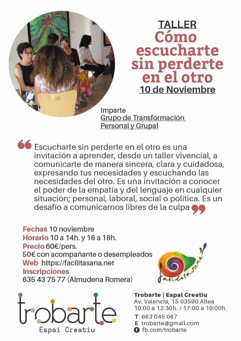 Os invitartamos a uno de nuestro talleres vivenciales, donde nos encanta crear espacio para el aprendizaje a través de la propia experiencia con un mínimo de teoría, que tendrá lugar este sábado 10 de noviembre, en Altea (Trobarte).